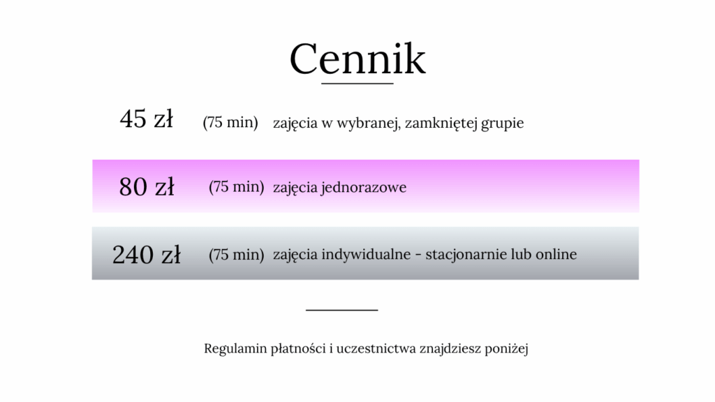 Uczestnik zajęć wybiera częstotliwość uczestniczenia w zajęciach w danym miesiącu (min 1 x w tyg) i opłaca z góry do każdego 5 dnia miesiąca kwotę równą ilości zajęć. Tym samym rezerwuje sobie miejsce na zajęciach w grupie zamkniętej. Brak płatności oznacza rezygnację z uczestniczenia w zajęciach i tym samym zwolnienie miejsca w grupie.